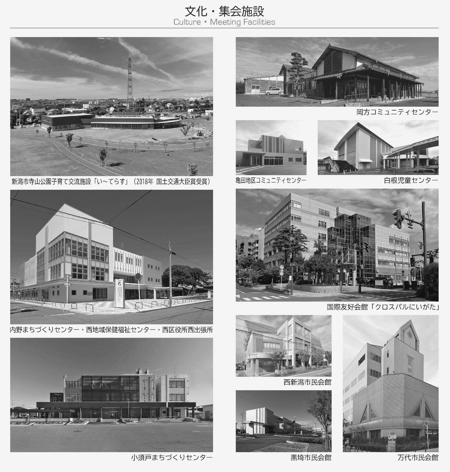 内野まちづくりセンター 用途 集会場 竣工年 2016年 所在地 新潟市西区 構造 S造:4F 延床面積 3,118㎡ 内野まちづくりセンター 文化施設INDEXへ 外部写真 内部写真 寺山公園屋内教養施設い~てらす 小須戸まちづくりセンター 亀田地区コミュニティセンター